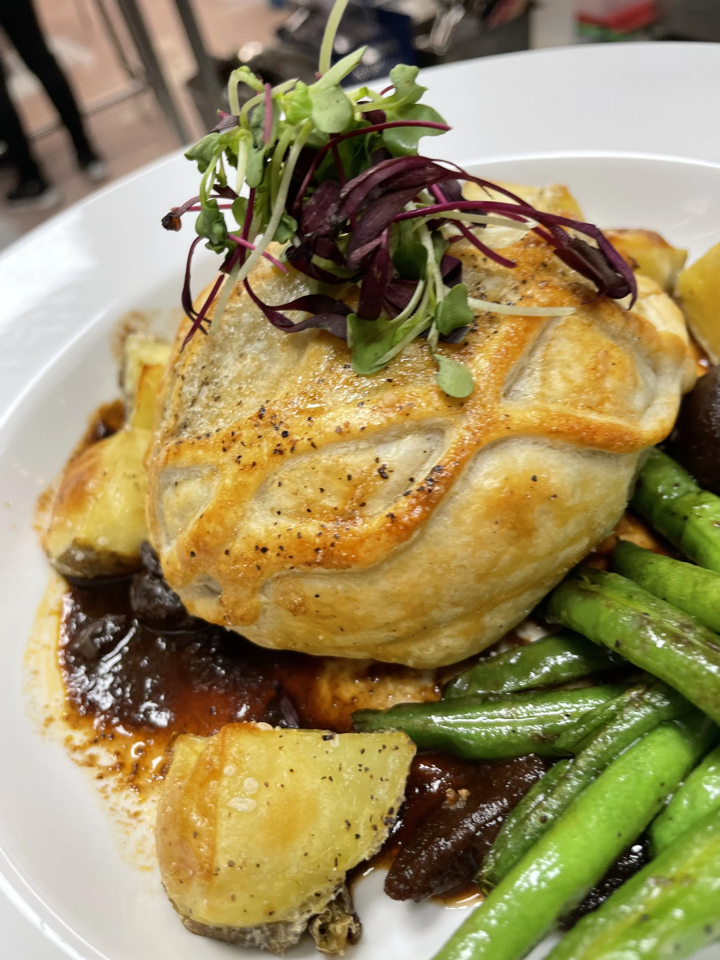 Eggplant, zucchini, squash, tomato, swiss and fontina cheese wrapped in puff pastry served with our au poivre and sauce de tomate.
