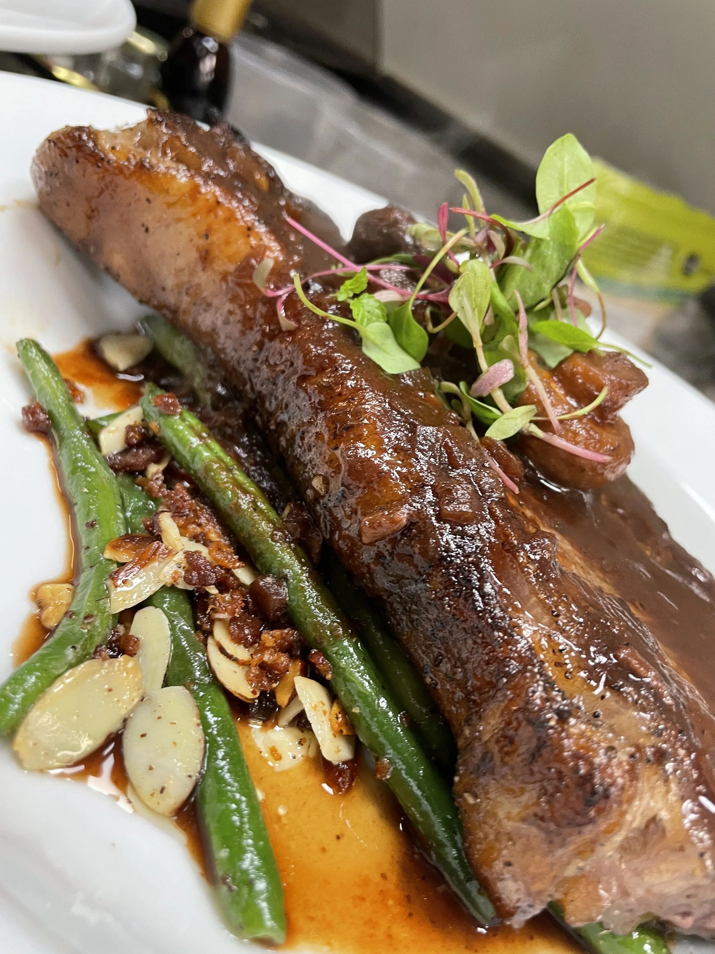 8 oz filet mignon seared and topped with shallots and creamy Porto wine reduction.