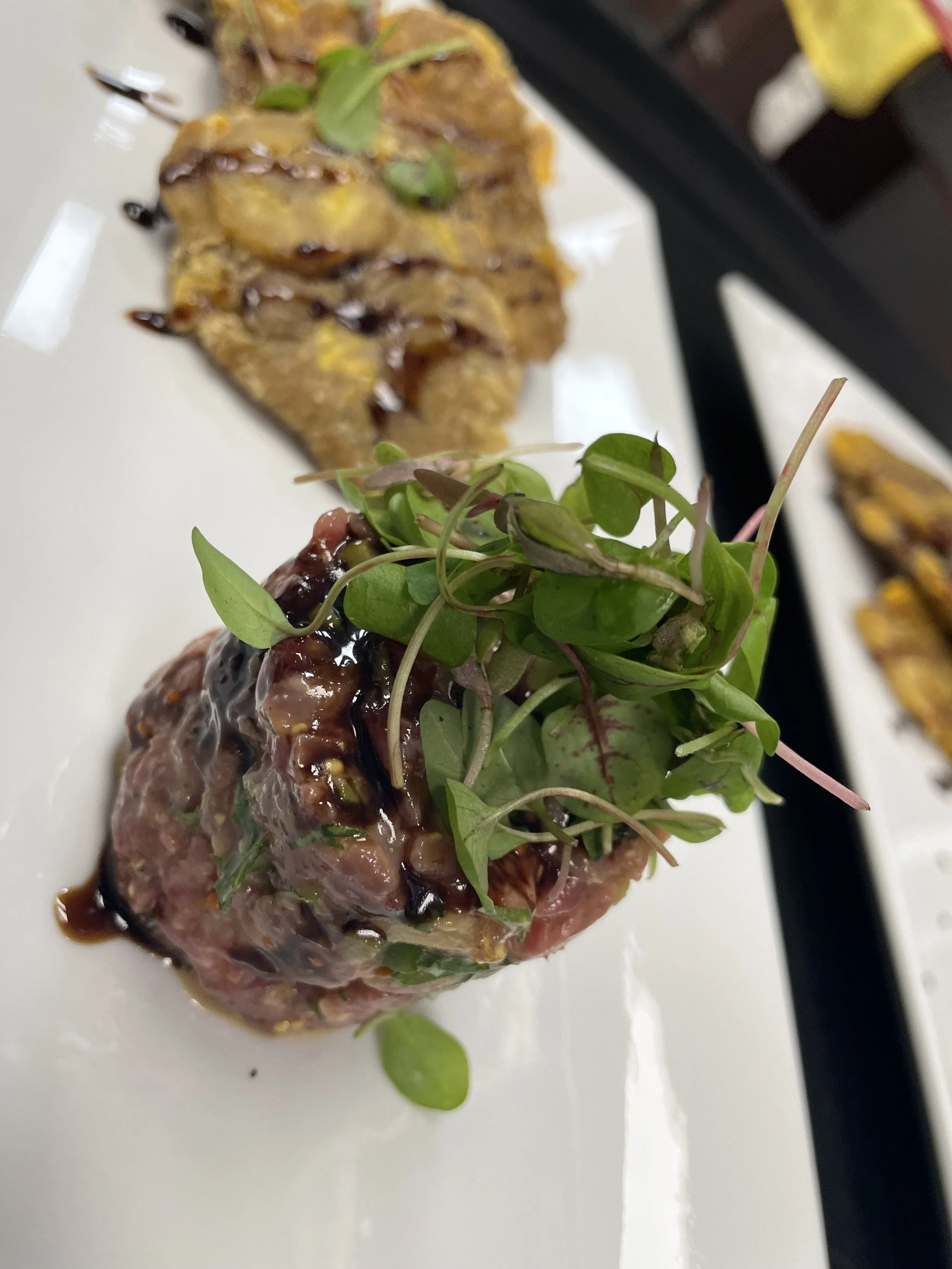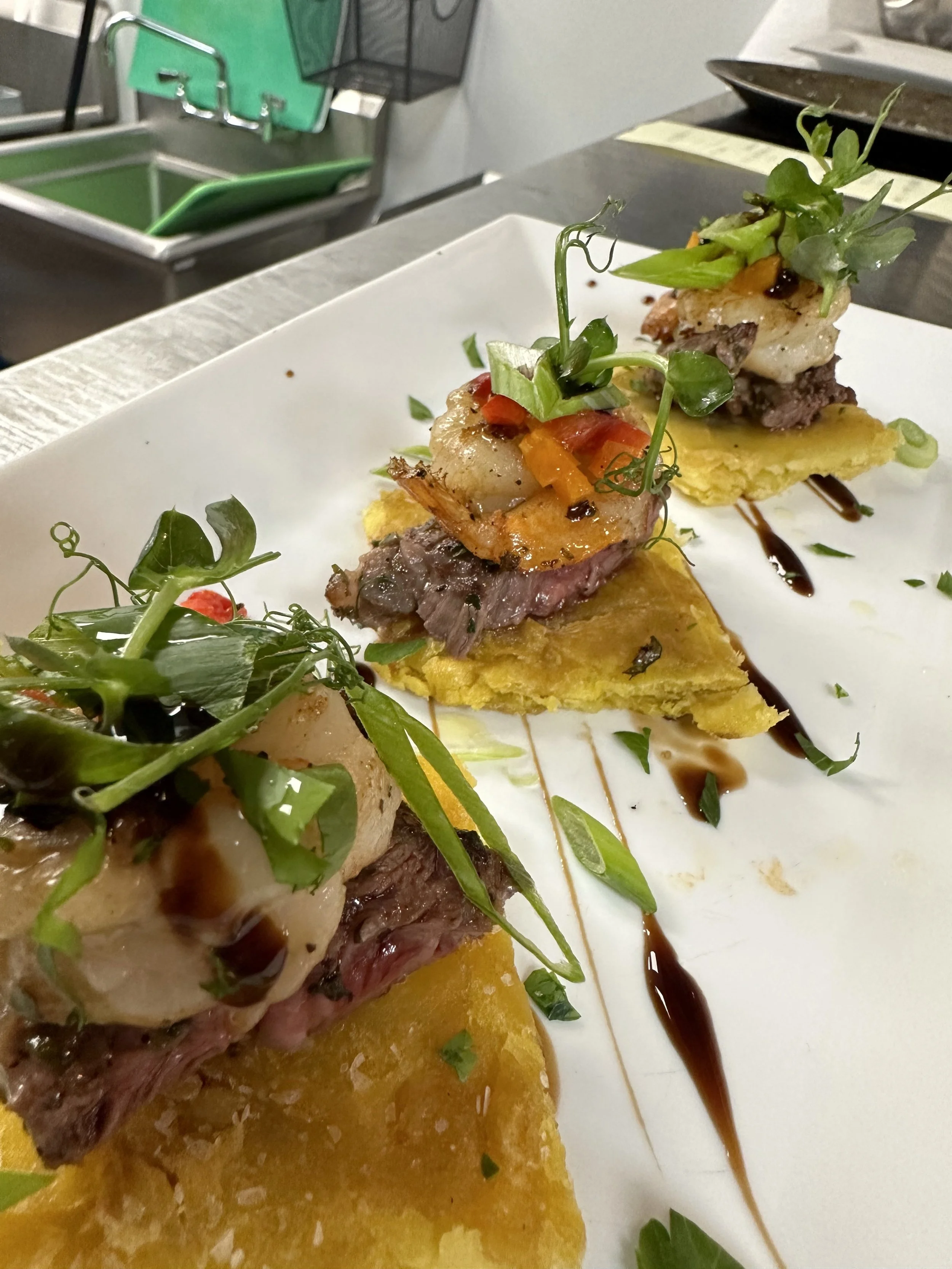 Your choice of seared shrimp, NY Strip or both on top of fried plantains accompanied with a chimichurri sauce.